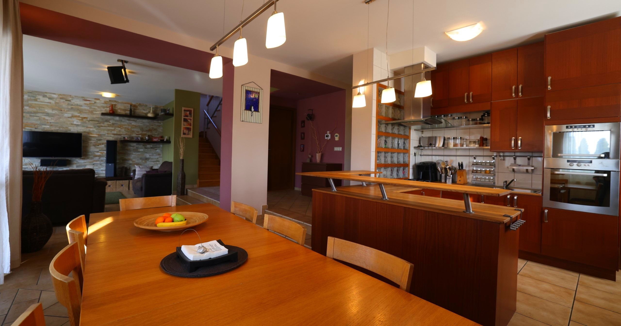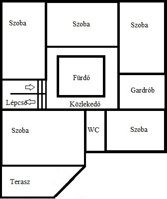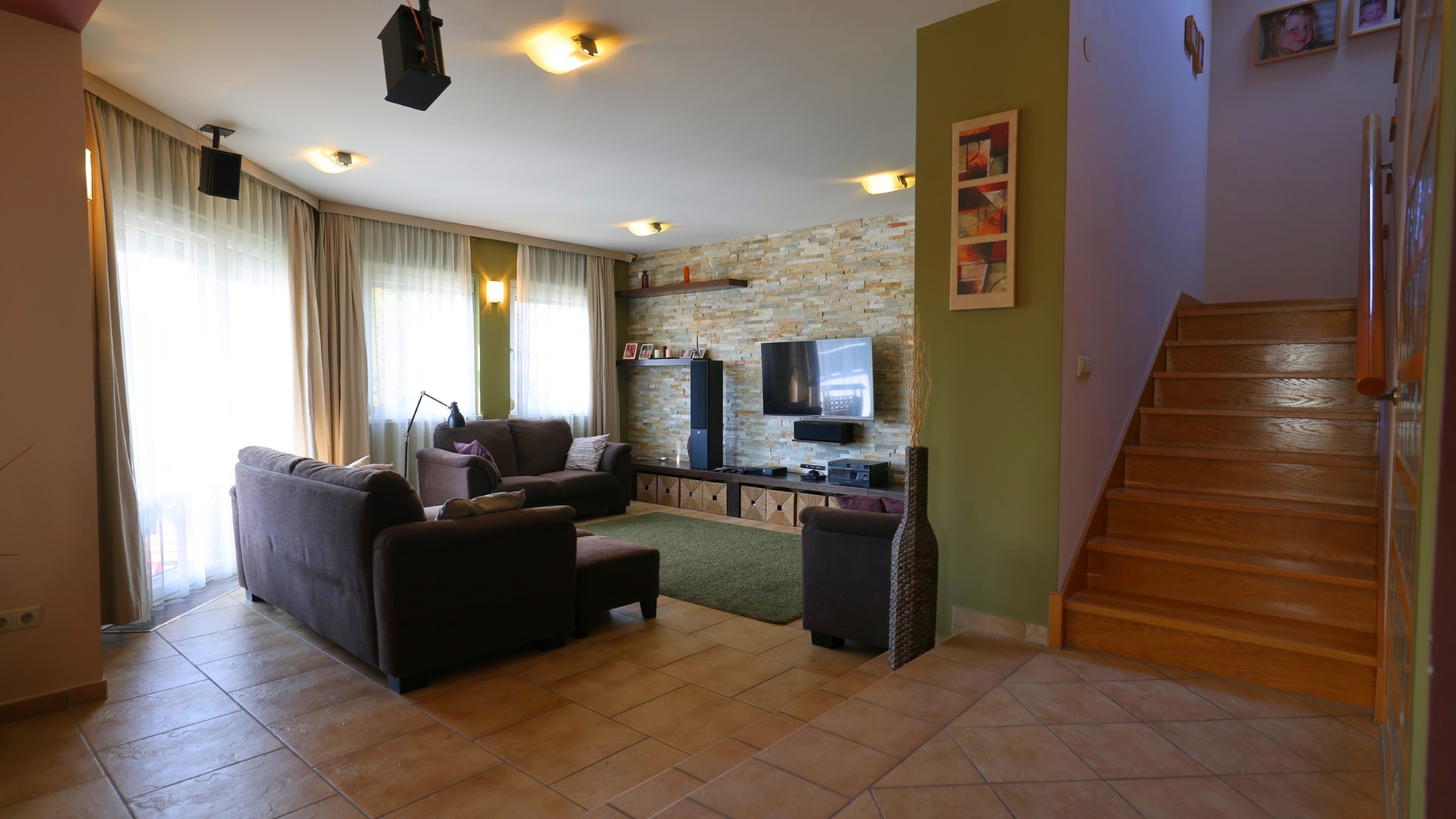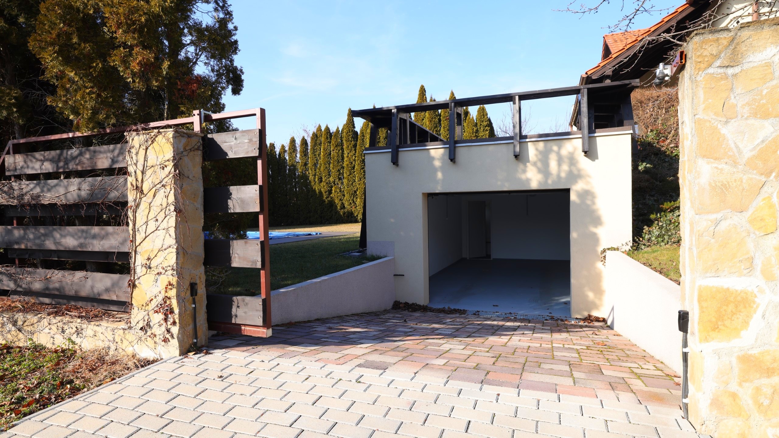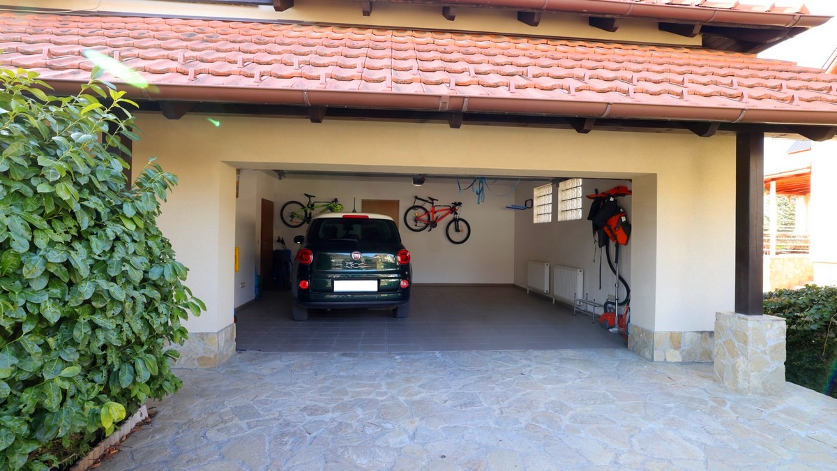 - Erdgeschoss: nach Westen ausgerichtetes Wohn–Esszimmer mit Küche und direktem Zugang zum Garten und zur Terrasse; Doppelgarage+eine Garage, Gästezimmer, Bad, Speisekammer