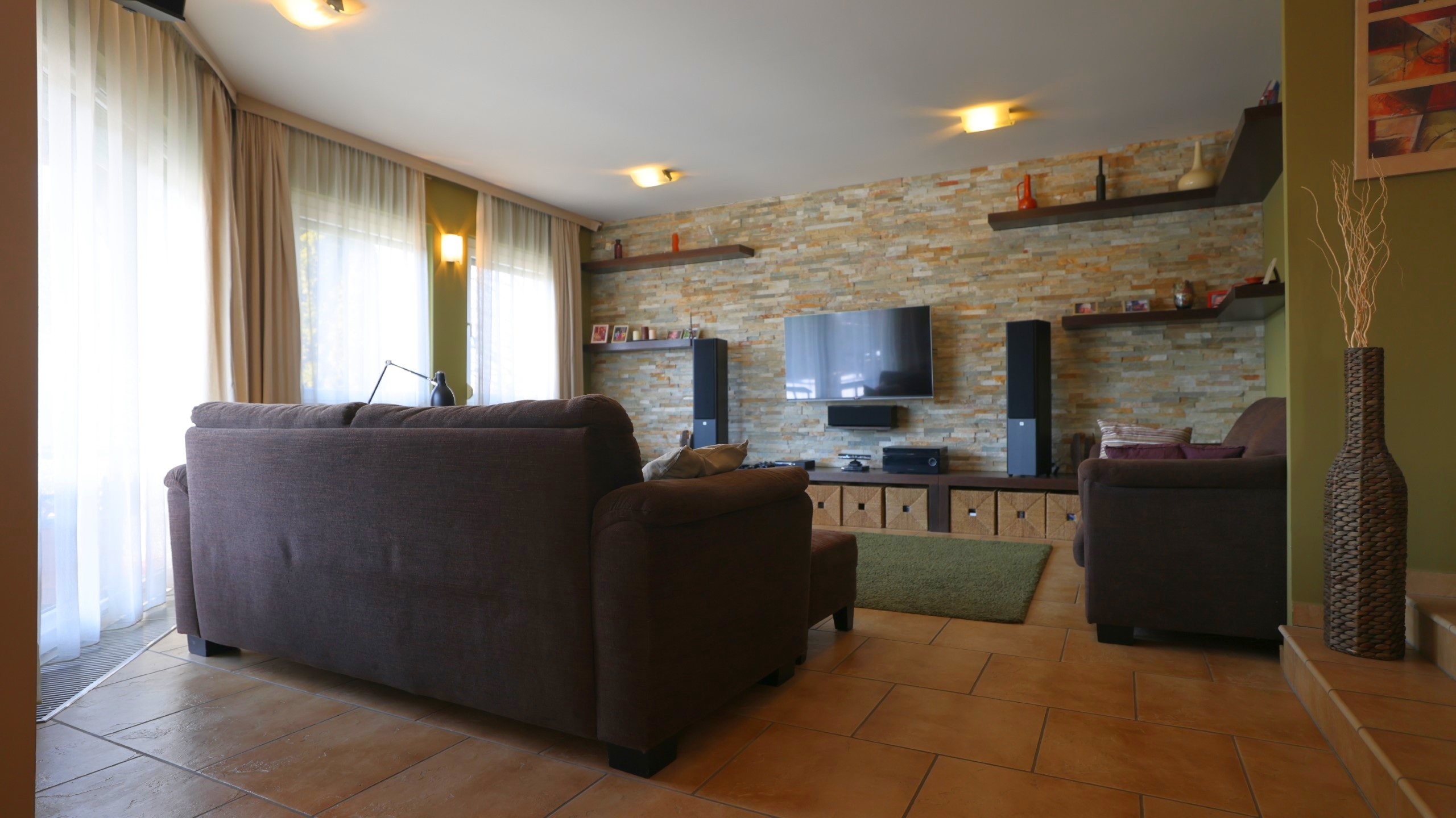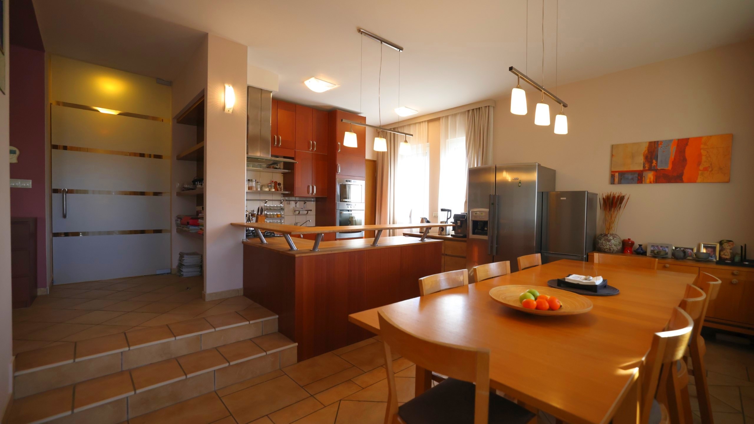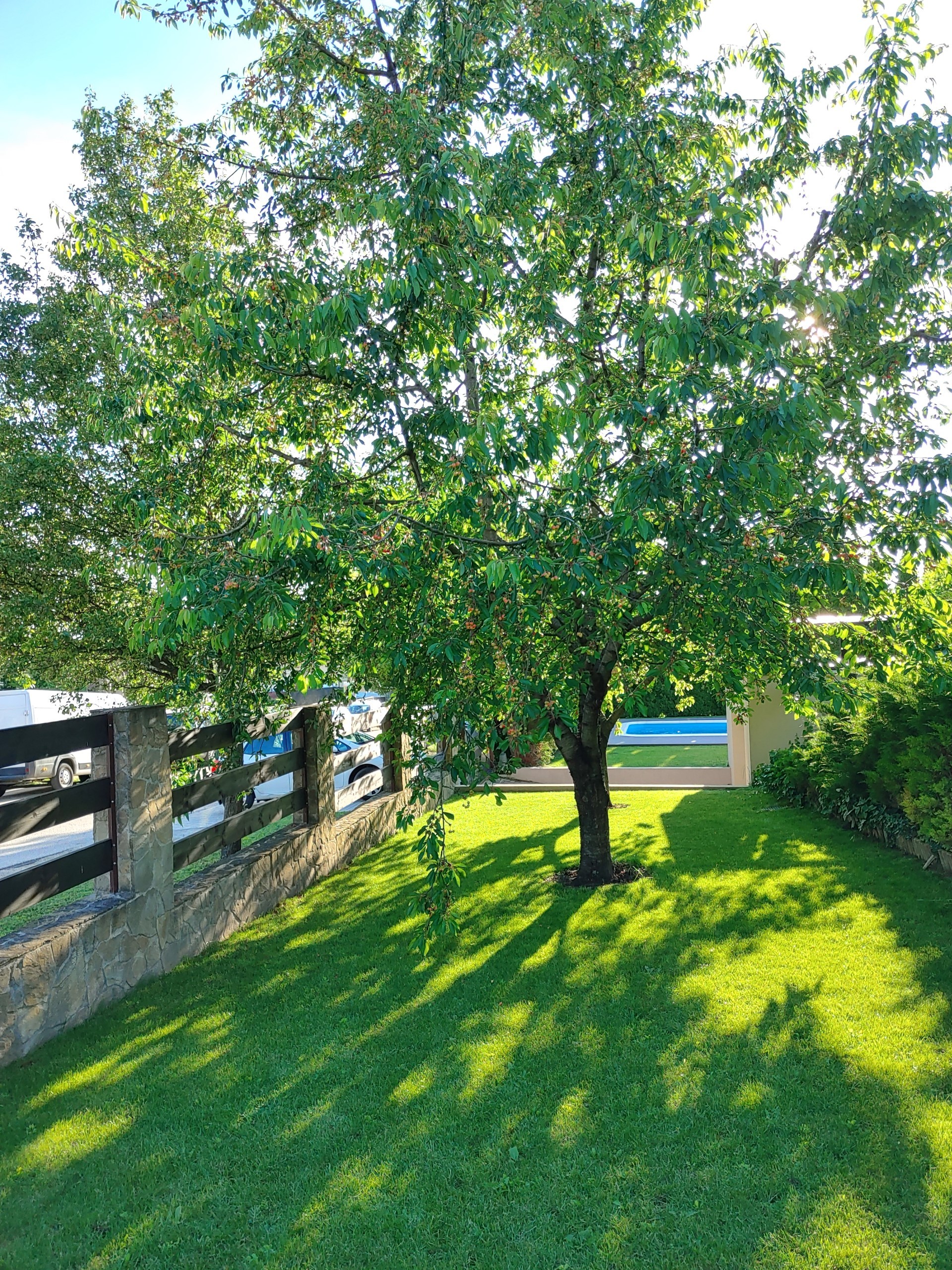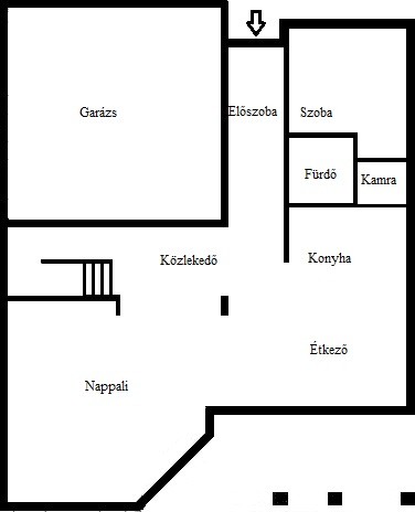 - Erdgeschoss: nach Westen ausgerichtetes Wohn–Esszimmer mit Küche und direktem Zugang zum Garten und zur Terrasse; Doppelgarage+eine Garage, Gästezimmer, Bad, Speisekammer