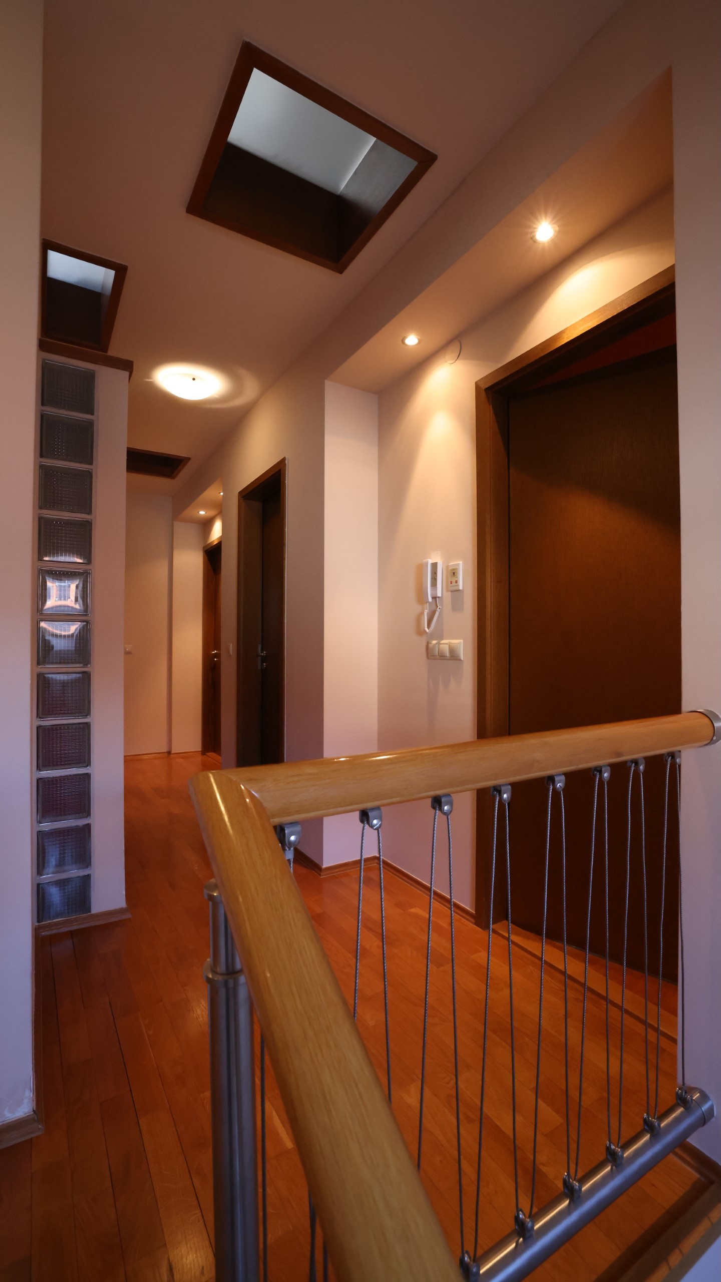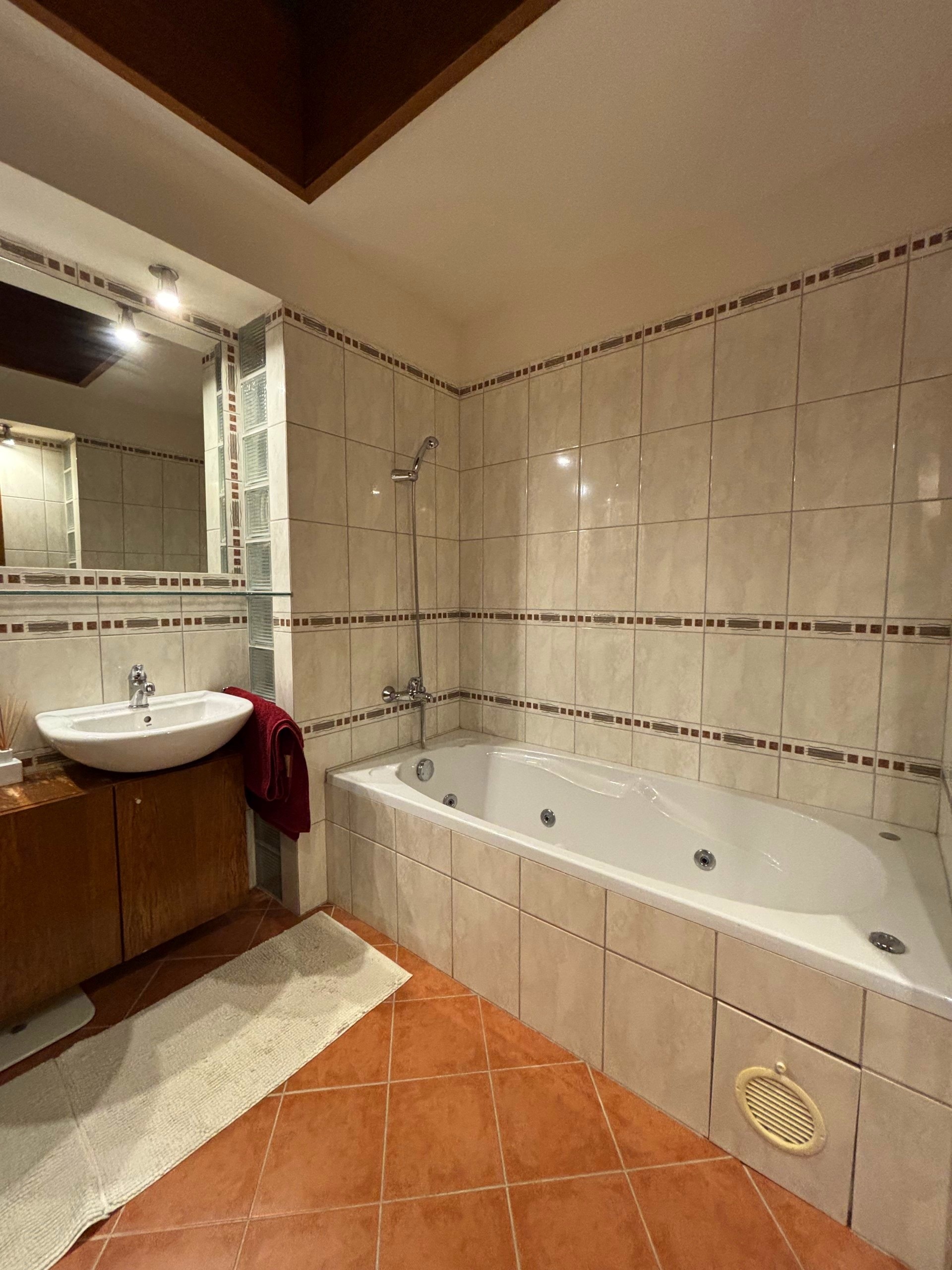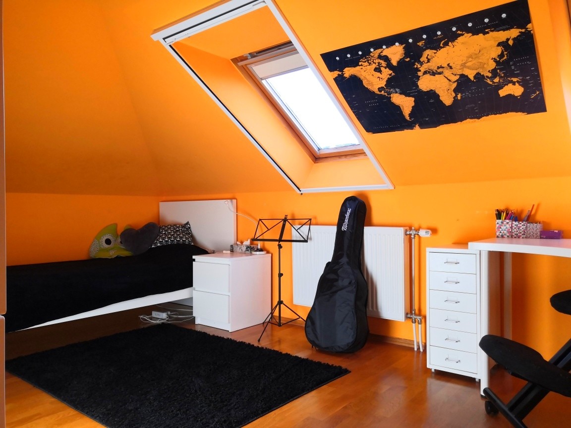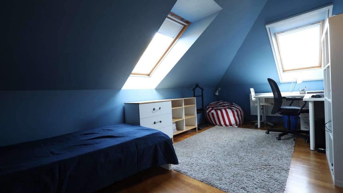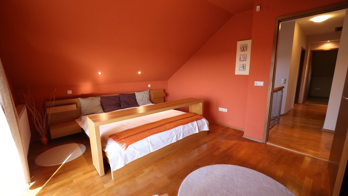 - Dachgeschoss: Elternschlafzimmer, Arbeitszimmer, drei Kinderzimmer, Ankleide, Badezimmer mit Whirlpool, Dusche, Doppelwaschbecken und WC, separates WC